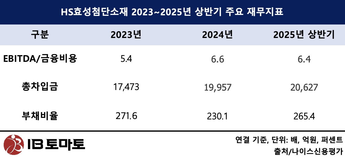 그러나 HS효성첨단소재의 차입 구조는 단기간 내 개선이 쉽지 않은 상황이다. 최근 나이스신용평가에서 발표한 HS효성첨단소재 신용평가보고서에 따르면 회사의 총차입금은 2020년 말 1조6110억원에서 지난해 말 1조9957억원으로 증가했고, 올해 상반기에는 2조627억원까지 확대됐다. 차입 규모가 5년 새 꾸준히 증가해 온 셈이다. 영업활동현금흐름이 꾸준히 발생하고는 있지만, 잉여현금흐름이 크지 않아 차입 의존도가 오히려 높아진 것이다.