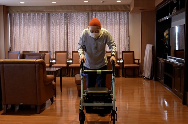 요양사들의 도움 없이 직접 걷는 나카가키씨(사진=IB토마토)