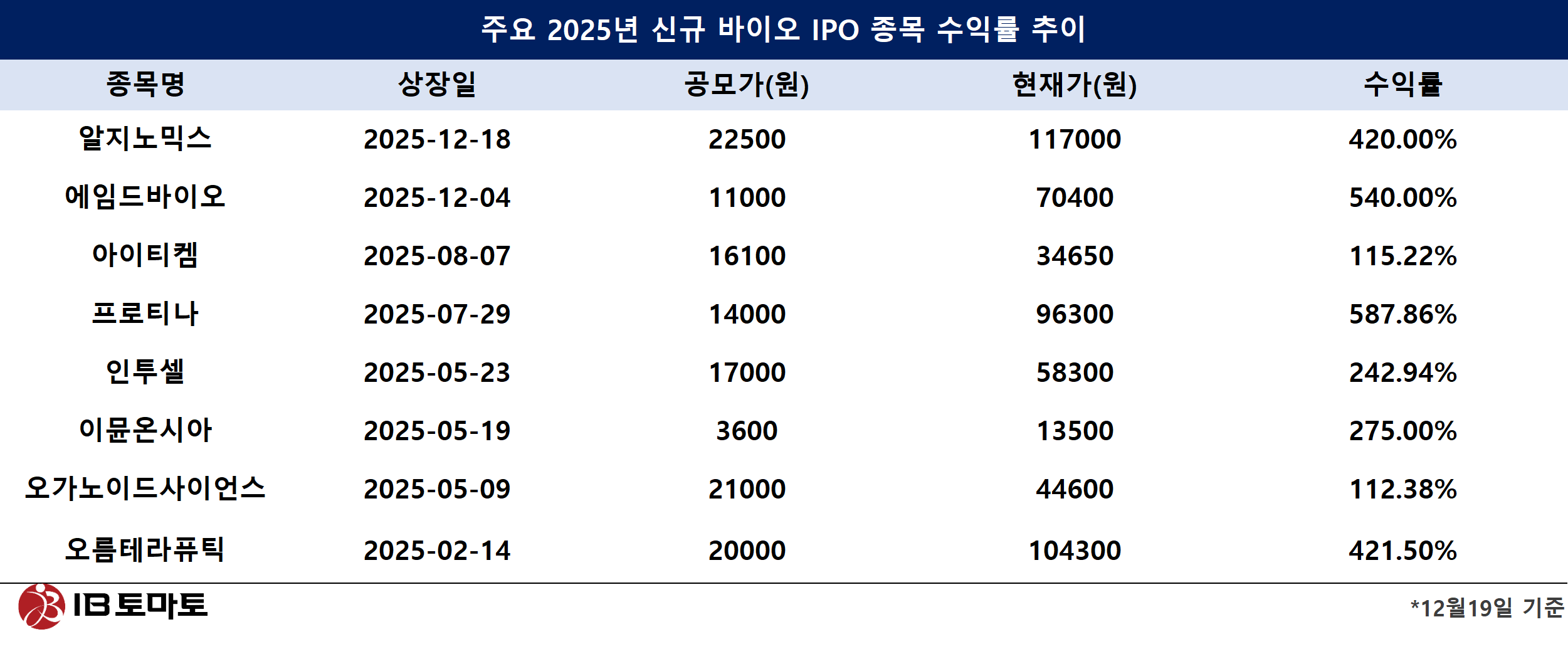 올해 국내 주식시장을 보면 코스피의 경우 AI 관련 대형주가 주도했다. 코스닥은 바이오 공모주가 이끌었다. 올해 신규 상장 종목 수익률 상위권에선 바이오 신규 상장 종목들이 상위권을 차지했다.