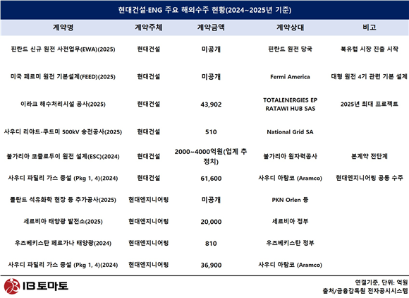 현대건설은 자회사 리스크 정리를 계기로 수익성과 리스크를 동시에 관리하는 방향으로 수주 전략을 바꾼 것으로 보인다. 지역도 중동에 집중했던 과거와 달리 유럽·북미·동유럽 등으로 분산이 이뤄지고 있으며, 원전·신재생·인프라 분야에선 EPC 본계약 이전 단계인 사전업무(EWA)와 기본설계(FEED)를 중심으로 진입해 초기 리스크를 통제하려는 모습도 뚜렷하다. 2025년에는 해외 수주에서 삼성물산에 이어 업계 2위를 달성키로 했다.