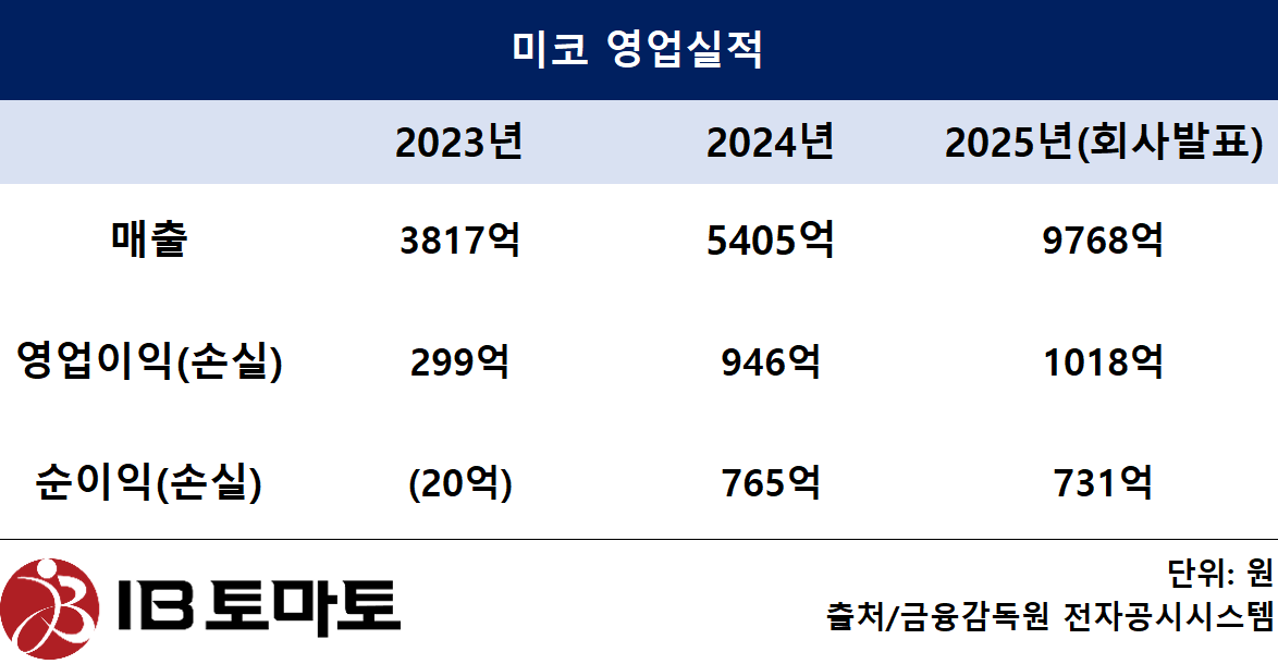 최근 실적 흐름을 보면 외형 성장세가 두드러진다. 미코의 매출은 2023년 3817억원에서 2024년 5405억원으로 늘어난 뒤 지난해 9768억원까지 확대됐다. 영업이익 역시 같은 기간 299억원에서 946억원, 1018억원으로 상승곡선을 그렸다.