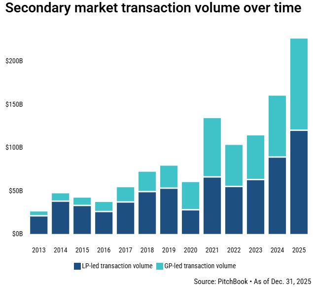 글로벌 리서치 기관 피치북에 따르면 2025년 글로벌 세컨더리 거래 규모는 기관투자자(LP)와 GP가 주도한 거래를 합쳐 총 2260억달러(약 316조원)로 사상 최대치를 기록했다. 이는 전년 대비 약 41% 증가한 수준이다.